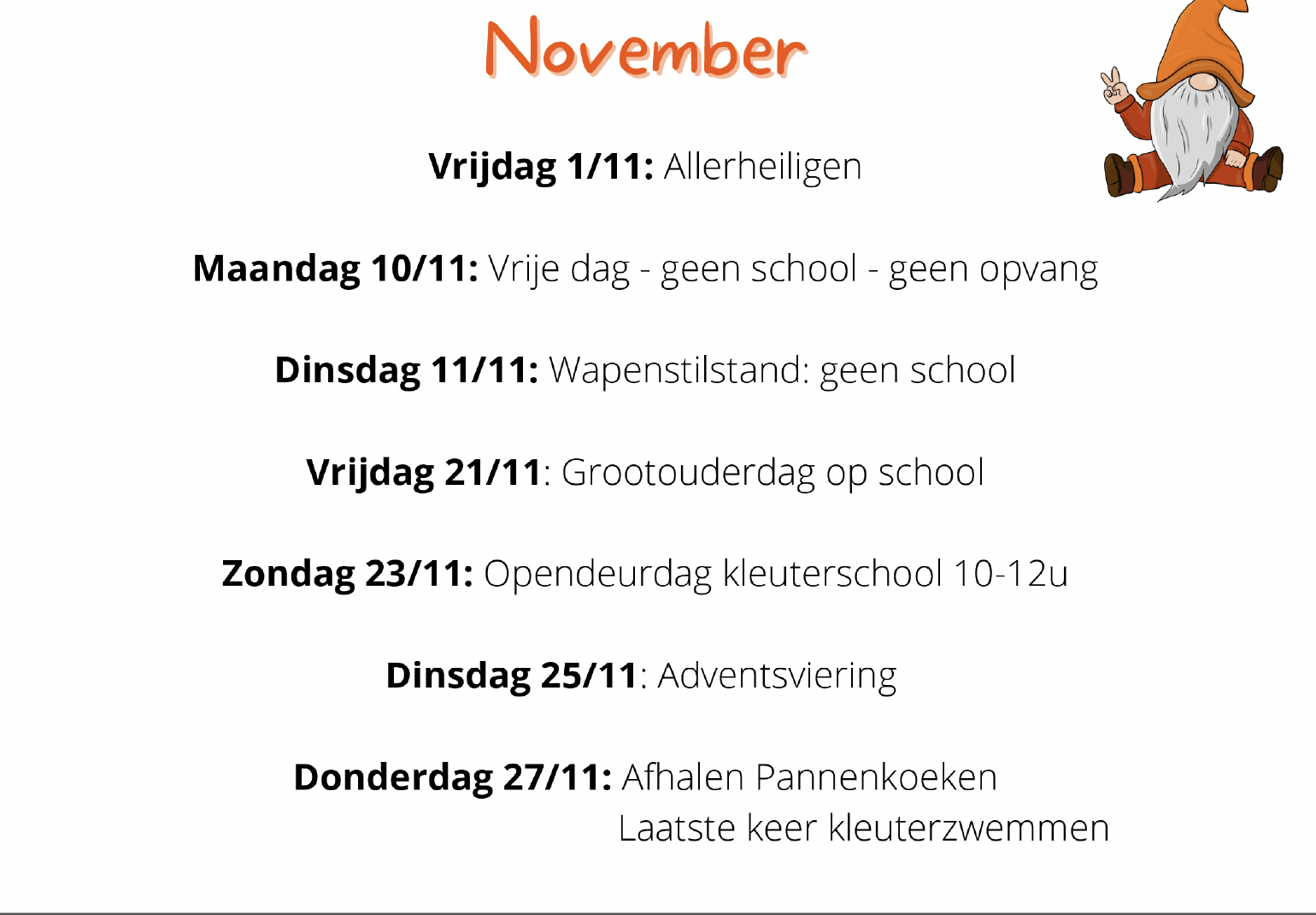 Maandag 10 november 2025 LOKALE VERLOFDAG: Geen school, er wordt die dag geen opvang voorzien in het speelhuisje.